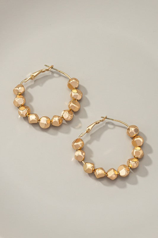 Medium hoop with hammered metal beads. Made of iron. Shiny gold plating. Size: 1.75\"